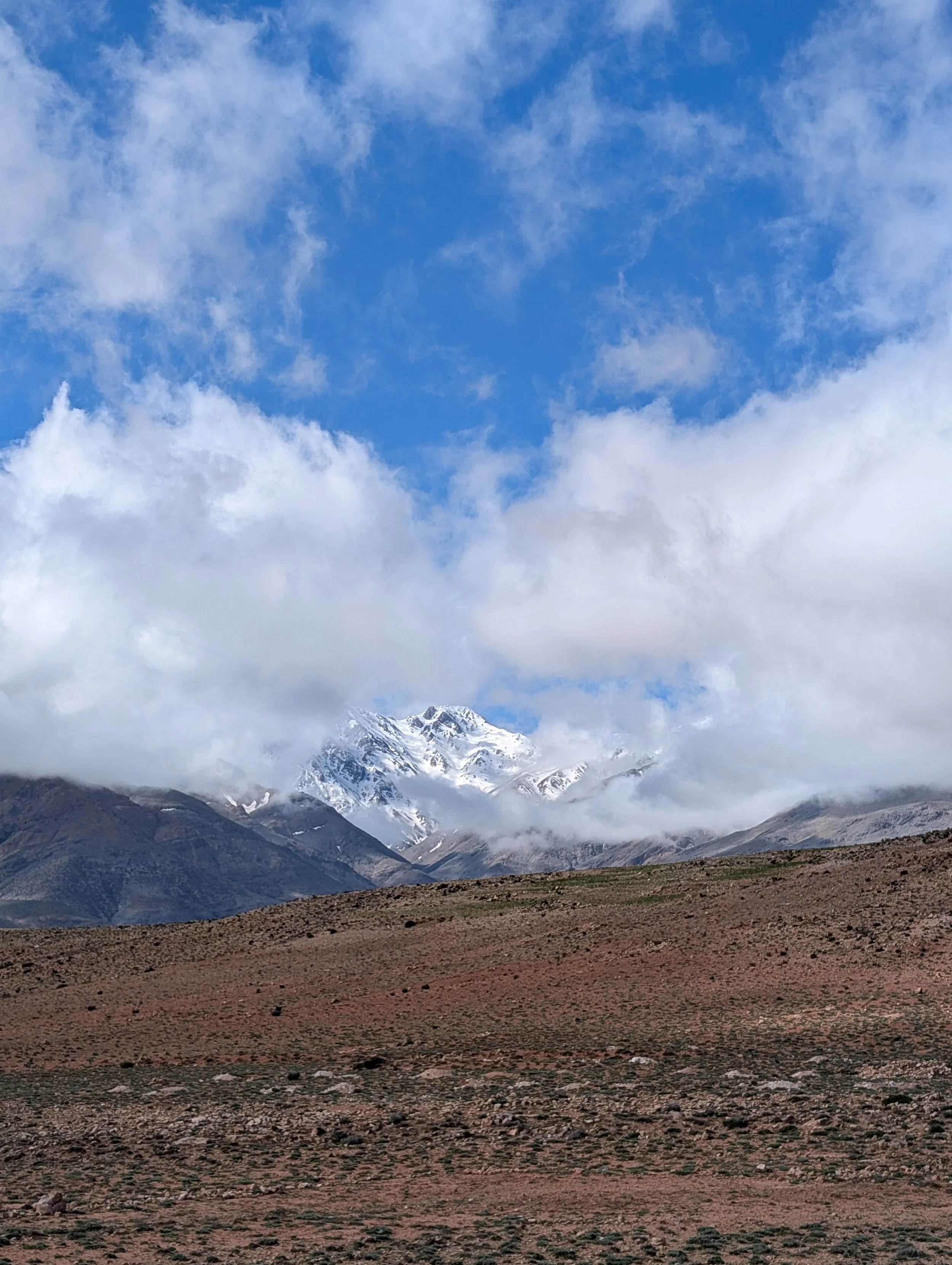 We talk about it as we keep driving up the mountain. We pass some large colourful metal containers. It turns out that they are local schools - the replacements of the ones destroyed by the earthquake. The snowy mountain tops start peeking over the horizon. Marco asks Latifa if there will be a chance to go to a bathroom in the upcoming hour. Of course, she says, and the car stops right away. So Marco walks away to use the meadow bathroom with a stunning view, while I stay in the car. Latifa says that we could just drive away. We could kidnap you, she adds. We laugh. My laugh is slightly cautious, but hey, Latifa seems to be a trustworthy lady, and if anything, her joke just confirms it. Marco soon returns all excited that he spotted Thekla’s lark, so it turns out that while I sat in the car being offered an experience of kidnapping, he was wandering around the meadow birdwatching with his monocular. Classic.