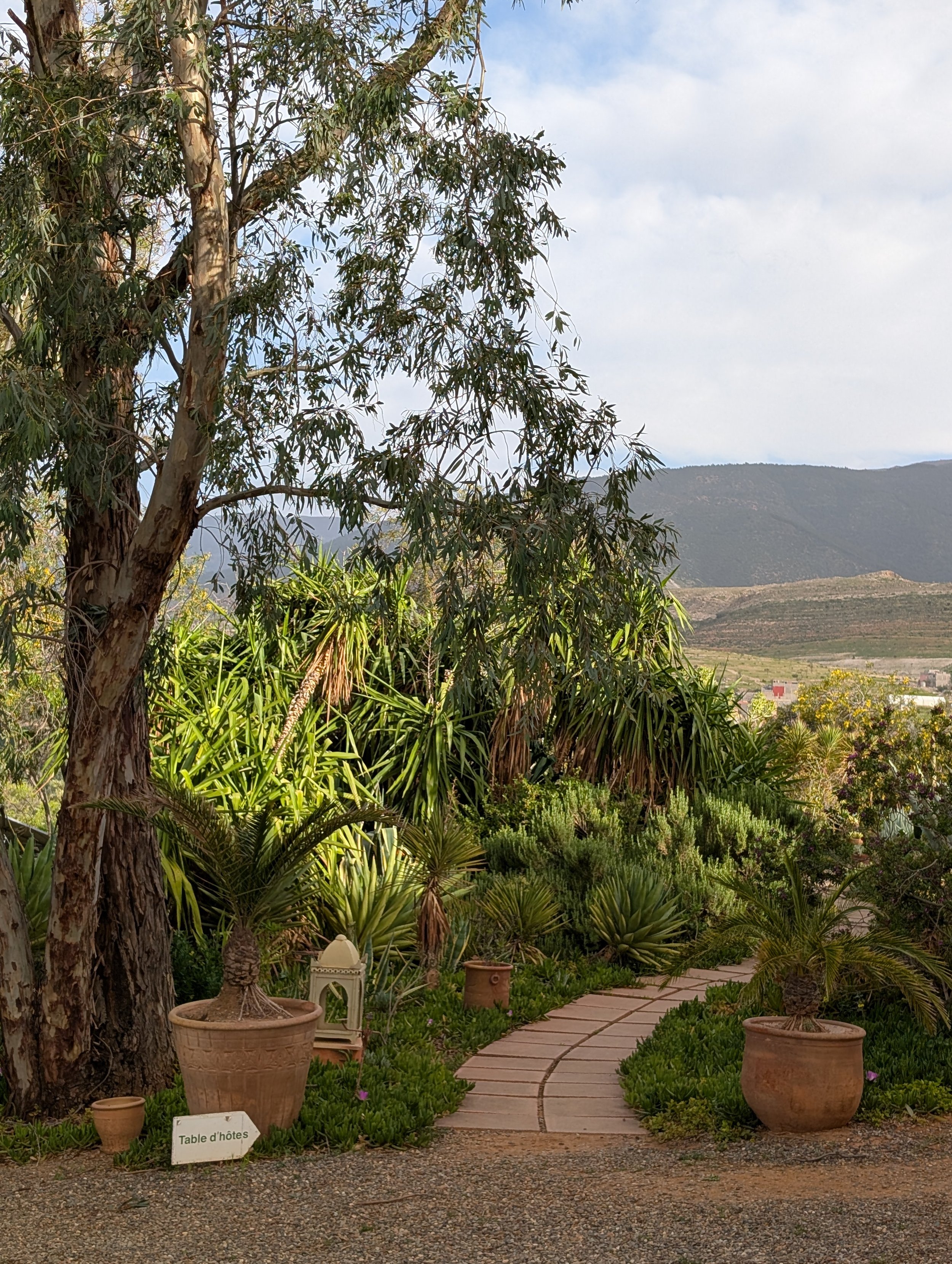 We say goodbye to Omar and say hello to Hussein, whom we follow through a winding tile path along fig trees, pomegranate trees and giant cacti. Once we reach a hut, that we will get to know as a breakfast, lunch, dinner, and reception space, we finally meet Bruno. Bruno, it turns out, is a French-speaking man in, we assume, his eighties. He speaks slowly, and I mean, really slowly. He is wearing a shirt, a sweater and a winter jacket. Which, frankly, scares us off, as, you know, we came to Morocco mid-spring and did not expect to open a wormhole straight back to winter. Bruno tells us that his guests usually describe the eco-lodge as heaven, but today it is hell - in his entire life he has never seen such tree-bending wind in these lands.